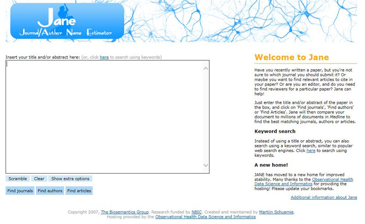 目前网上有许多在线期刊选择工具,然而,全球应用最广的非JANE莫属,它由荷兰的公司开发,为全球学者提供了一个非常简单的期刊搜索工具。JANE 包括了Medline中列出的所有期刊,因此更适合生物学和医学专业领域。作者可利用关键字、文章标题和摘要等因素搜索,并允许在搜索时选择几个选项包括开放获取政策(Open Access policies)、文章类型(Article Types)、出版语言(Publication Language), 例如作为临床试验和病例报告以及语言。