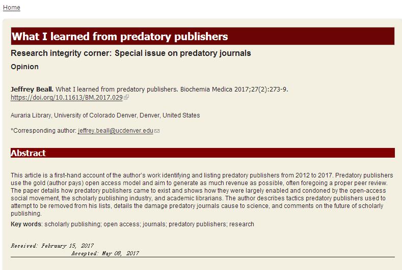 掠夺性期刊是一个价值数百万美元的产业,虽然很难去定义掠夺性期刊,但它们的数量还在不断增长,仍然在利用越来越为大家所熟知的开放获取出版模式。那么我们如何才能免受其害呢?一种方法是让研究人员自主学习有关掠夺性期刊的知识,从而及时识别出此类期刊。由于掠夺性期刊目前还没有在中国发展起来,因此中国的研究人员更应该学会如何识别此类期刊。