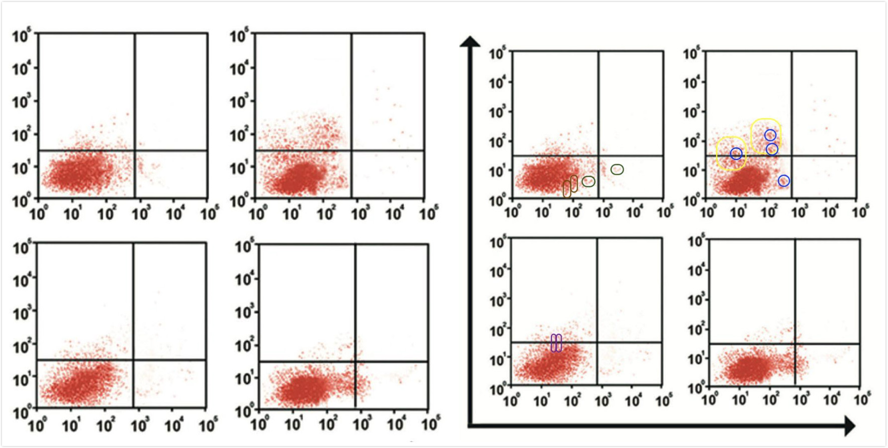 四个不同的流式细胞仪面板,每个代表不同的治疗组。有什么特别的发现吗?