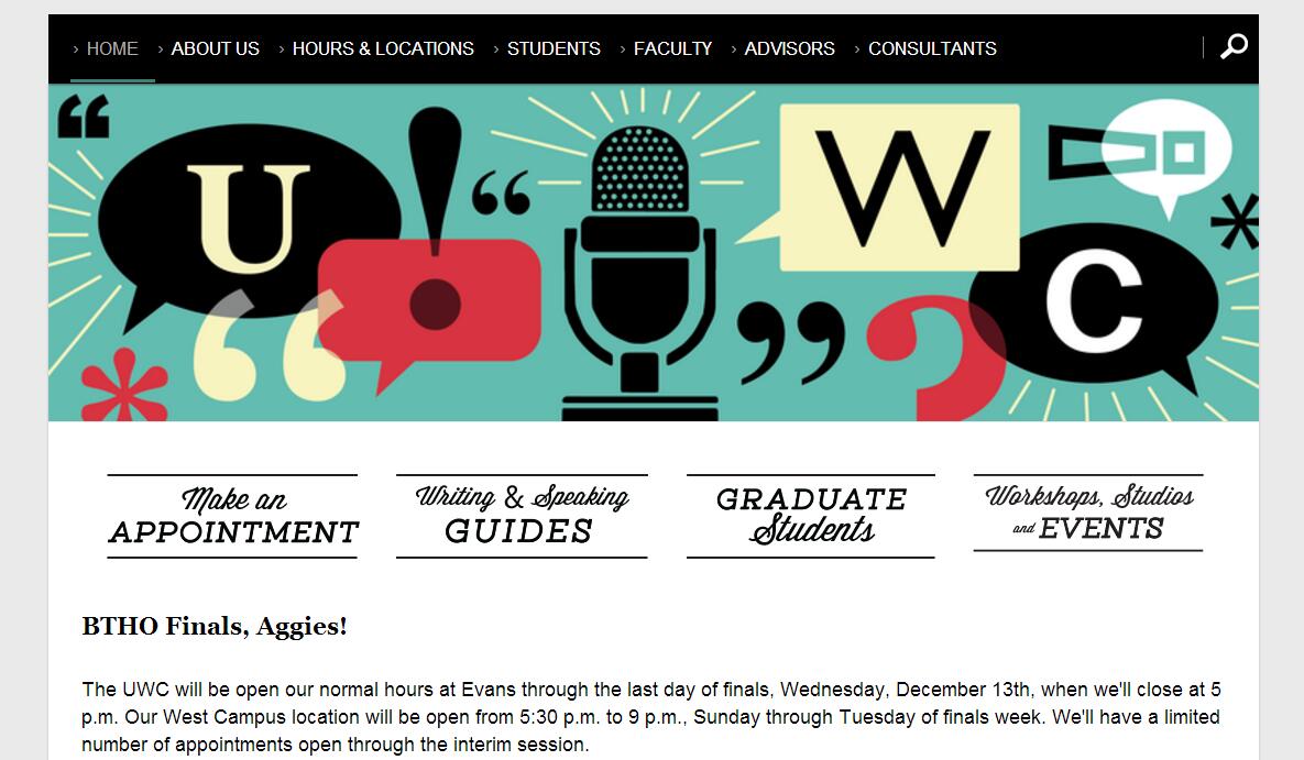 得州A&M大学写作中心绝对值得一提,因为它不仅包含了一系列的写作资源,还包括口语表达、在线讲座等等有用资源,其宗旨是“帮助学生挖掘学术潜力,深入且有目的地学习,通过丰富的教学计划,获得本专业发展所需技能”。