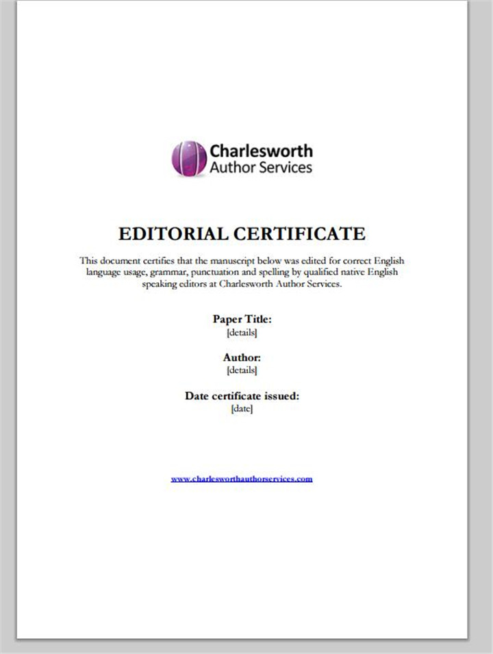 专业的语言润色机构,如查尔斯沃思,为了保证润色质量,会提供一份查尔斯沃思作者服务编辑证书作为质量保证(了解我们的编辑质量和服务标准)的一部分,作者可以在向目标期刊投稿时,将该编辑证书一同提交。 作者可以随时通过查尔斯沃思的在线管理系统自行下载证书。